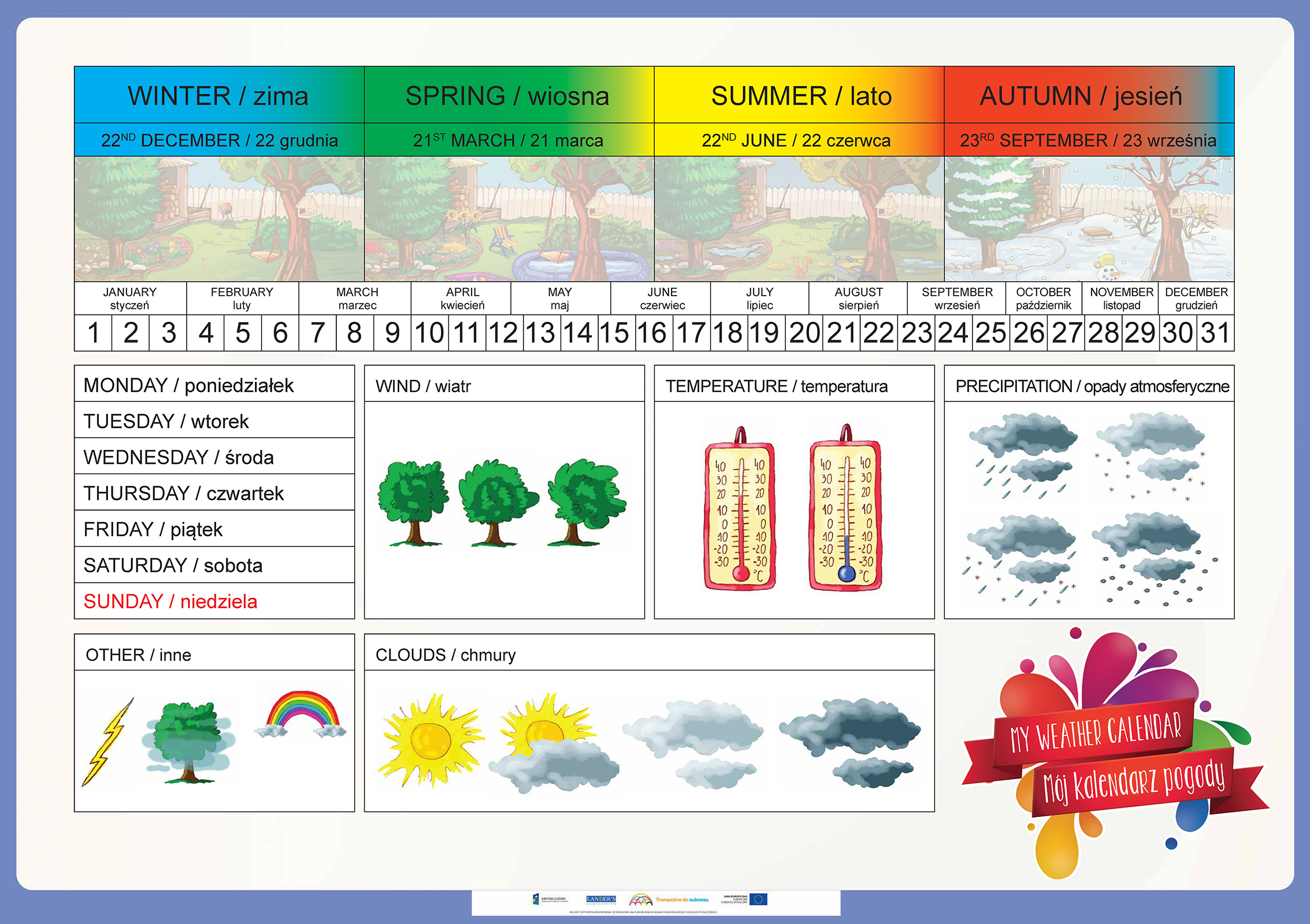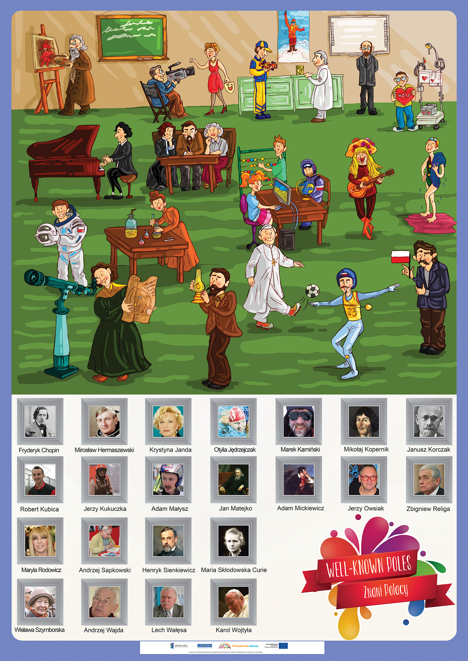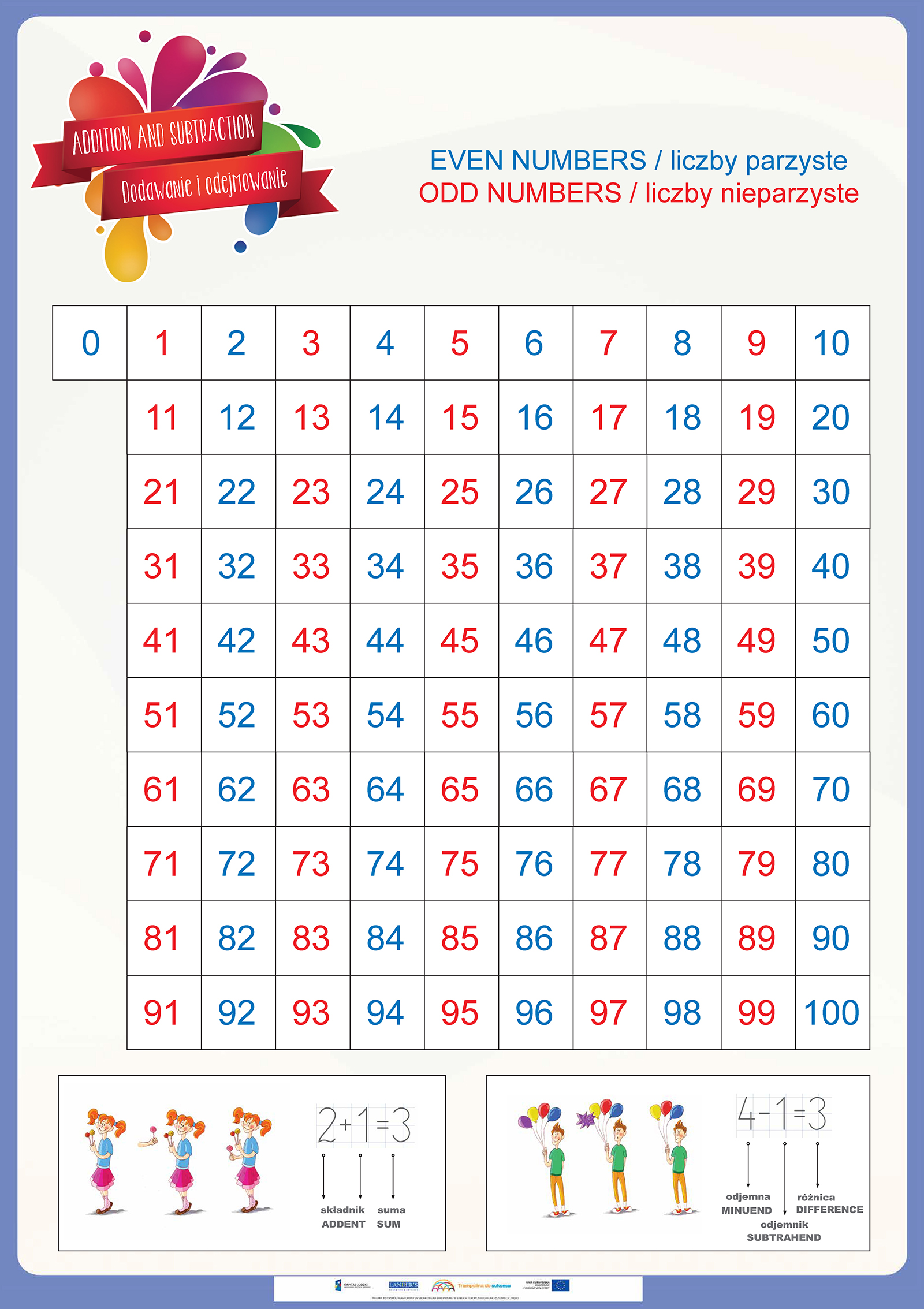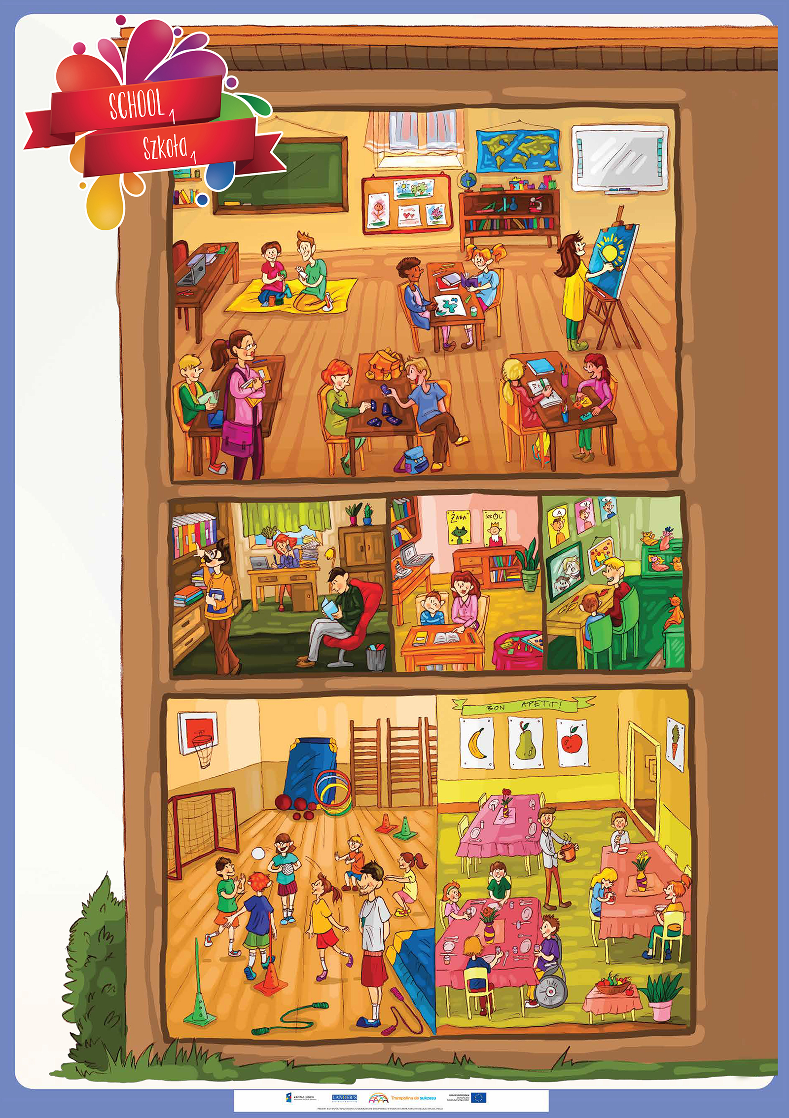 Opis Niniejszy zestaw zawiera 50 plansz edukacyjnych do zajęć lekcyjnych z zakresu języka angielskiego oraz edukacji wczesnoszkolnej dla uczniów klas 1-3 szkoły podstawowej do programu edukacji wczesnoszkolnej „Trampolina do sukcesu”. Tematyka plansz jest jest uniwersalna... Niniejszy zestaw zawiera 50 plansz edukacyjnych do zajęć lekcyjnych z zakresu języka angielskiego oraz edukacji wczesnoszkolnej dla uczniów klas 1-3 szkoły podstawowej do programu edukacji wczesnoszkolnej „Trampolina do sukcesu”. Tematyka plansz jest jest uniwersalna dlatego zasób ten może być wykorzystany w każdej klasie realizującej program edukacji wczesnoszkolnej zgodny podstawą programową. Program „Trampolina do sukcesu” integruje treści nauczania wczesnoszkolnego z treściami zajęć j. angielskiego, dlatego każda plansza opracowana jest w dwóch wersjach językowych tj. angielskiej i polskiej. Wszystkie plansze wraz z wszystkimi scenariuszami lekcji oraz elementami obudowy dydaktycznej dostępne również w aplikacji komputerowej dla nauczycieli "Trampolina do sukcesu". Aplikacja dostępna jest bezpłatnie na stronie www.trampolinadosukcesu.pl