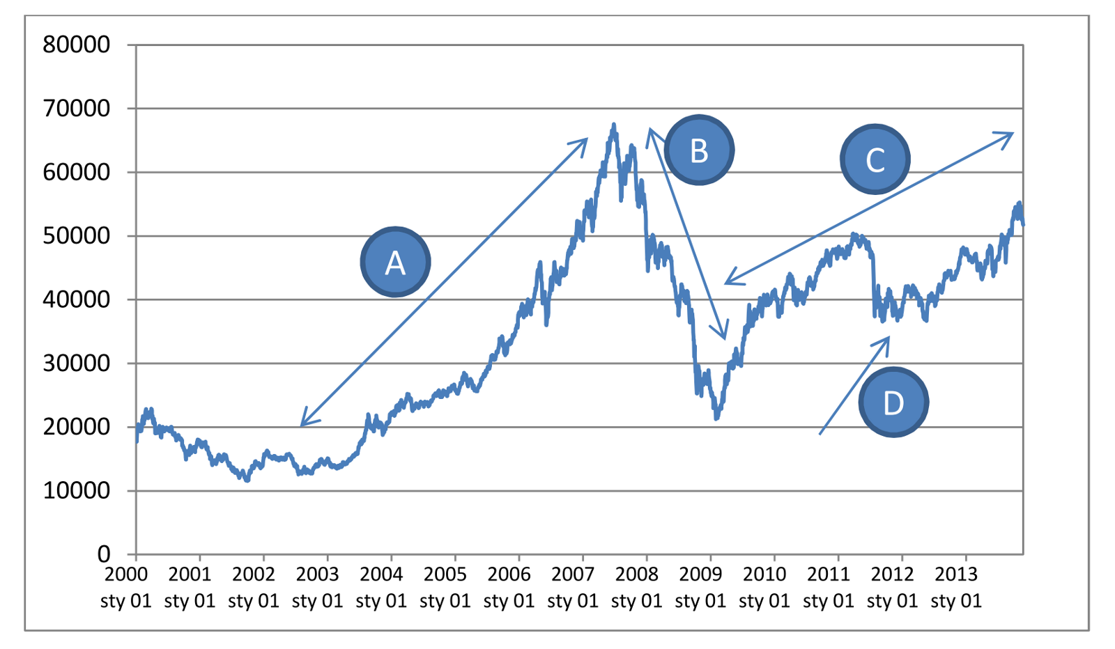 13. Na podstawie wykresu notowań pozagiełdowego rynku akcji w Stanach Zjednoczonych NASDAQ opisz wskazane punkty za pomocą terminów: hossa, bessa, korekta.